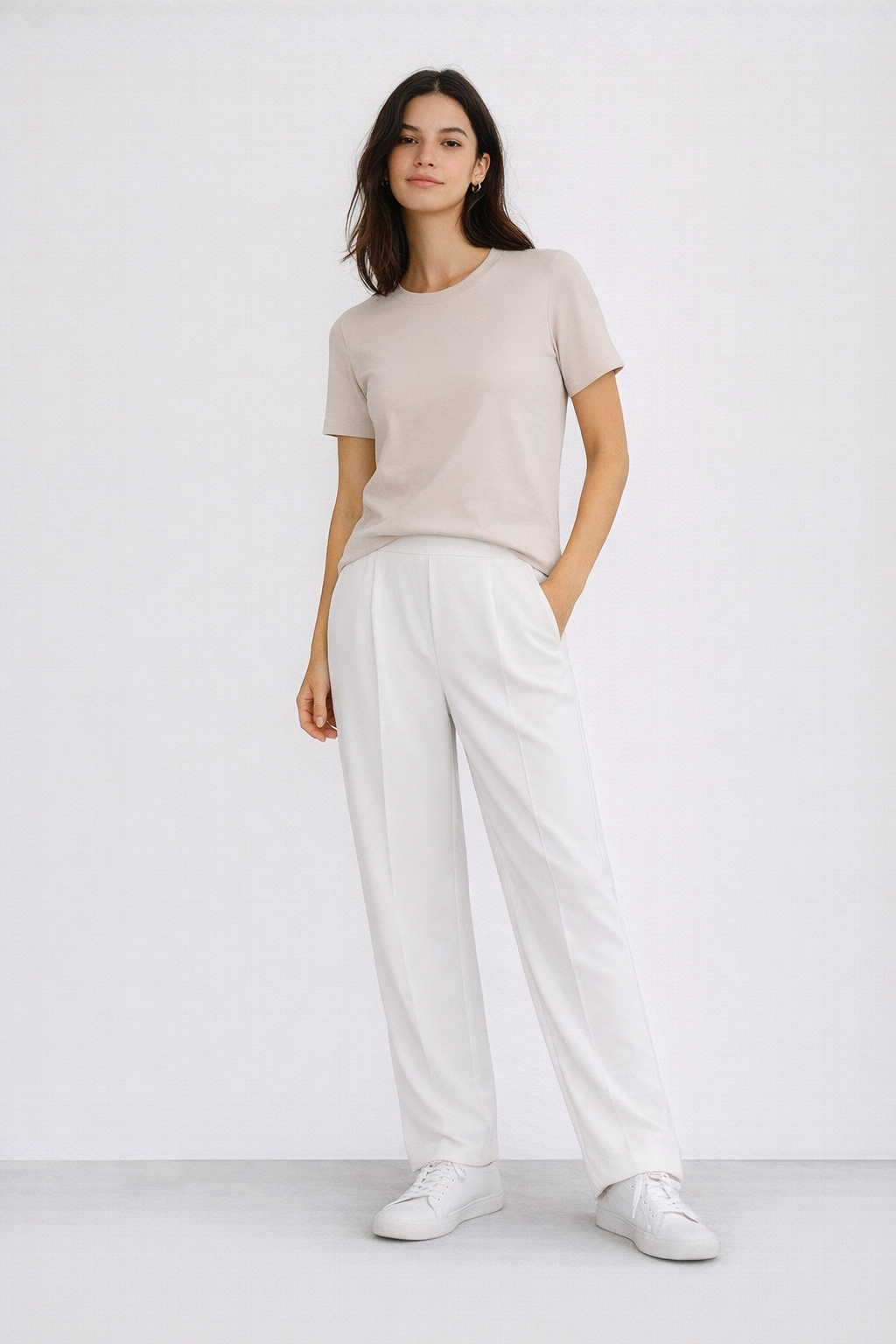 Su silueta se ubica entre el recto y el wide leg, logrando un fit relajado y versátil que estiliza sin perder comodidad. Presenta pinzas en el delantero que aportan estructura y una cintura con elástico en la parte trasera para mayor ajuste y confort.